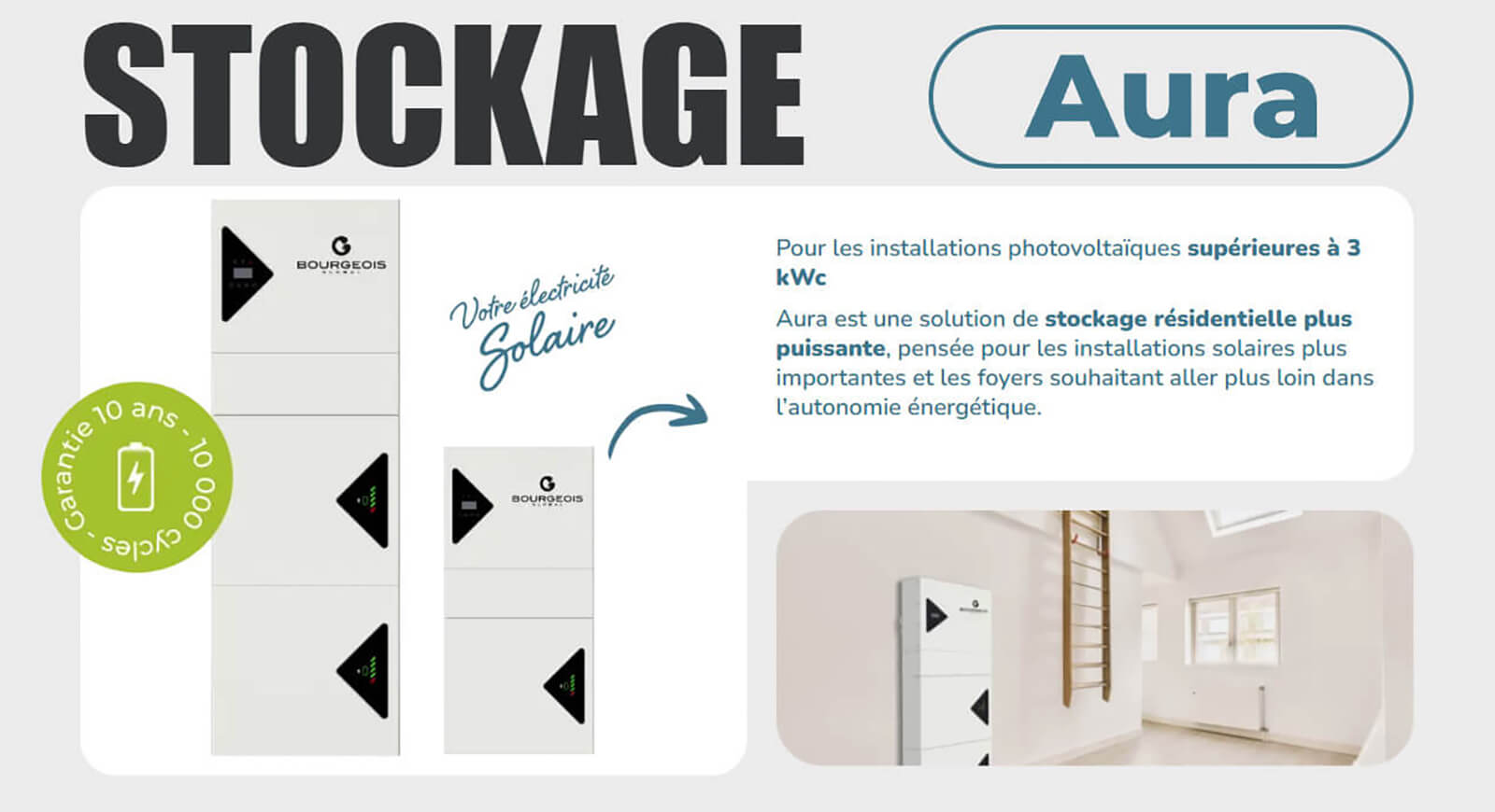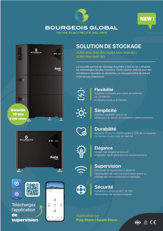 Nous travaillons également sur le développement de la batterie de stokage mini Aura de Bourgeois Global, une solution innovante conçue pour s’adapter à vos besoins :